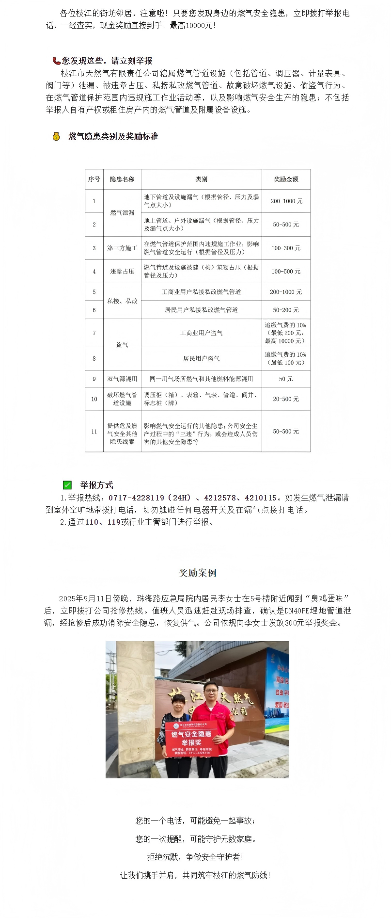 @枝江街坊 發(fā)現(xiàn)燃?xì)怆[患,馬上打電話!現(xiàn)金獎(jiǎng)勵(lì)等你拿→